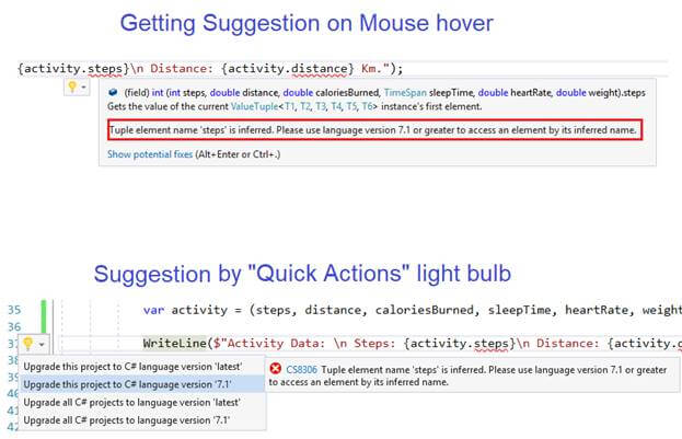 On mouse hover you will get a similar type of suggestion and “Quick Actions” light bulb will also suggest you do the same thing shown in the following screenshot.